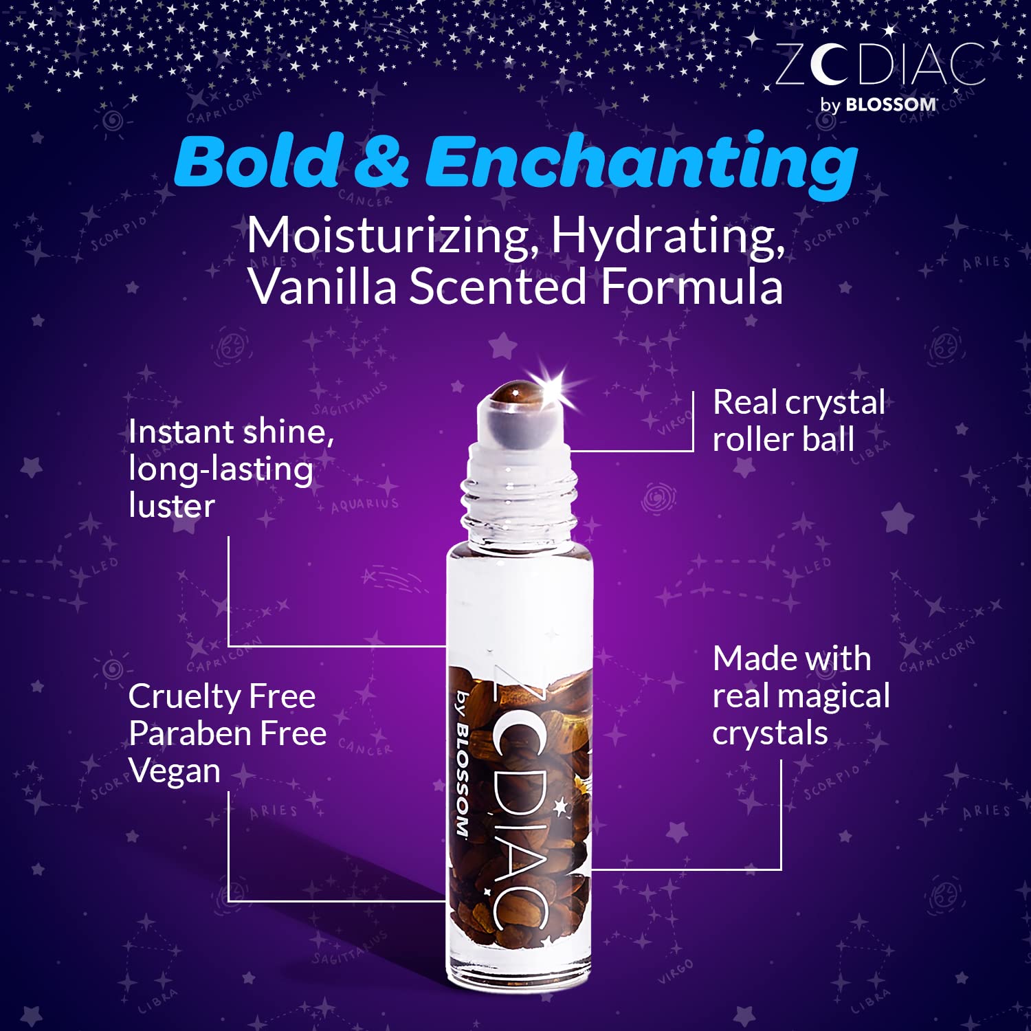 Introducing Zodiac Crystal Lip Gloss from Blossom, the ultimate cosmic companion for your lips! Each gloss is infused with crystals aligned with your zodiac sign, providing instant, long-lasting shine and a touch of celestial magic.
