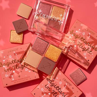Fly high with this Sagittarius In Flight Eye Shadow Palette by Colour Pop created for the ultimate jet setter sign! Take aim with shades Magnetic, a metallic terracotta, #goals, a metallic orange with gold sheen, Archer, a matte cool nude, and Free to Roam, a matte deep terracotta.