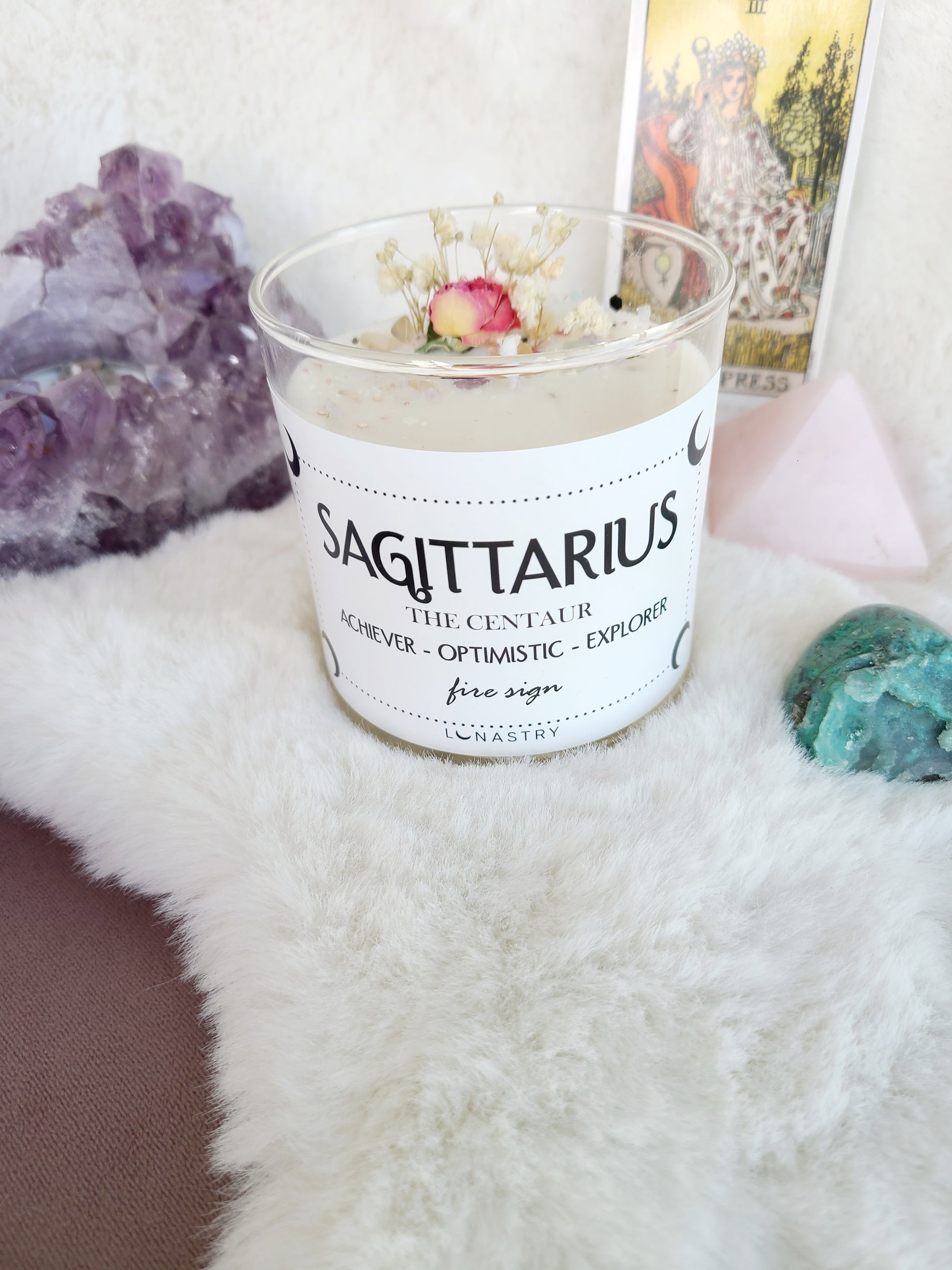 The candle is scented with Lavender Dreams, a herbaceous, aromatic and sweet lavender highlighted with golden amber, forest moss and exotic woods of smooth sandalwood, cedar and earthy patchouli to encourage freedom and adventure as well as help support self-worth of Sagittarians. It is topped with Fluorite, herbs & dried flowers. Fluorite cleanses and stabilizes the aura. It absorbs and neutralizes negative energy and stress. An excellent learning aid, Fluorite increases our powers of concentration & self-confidence.