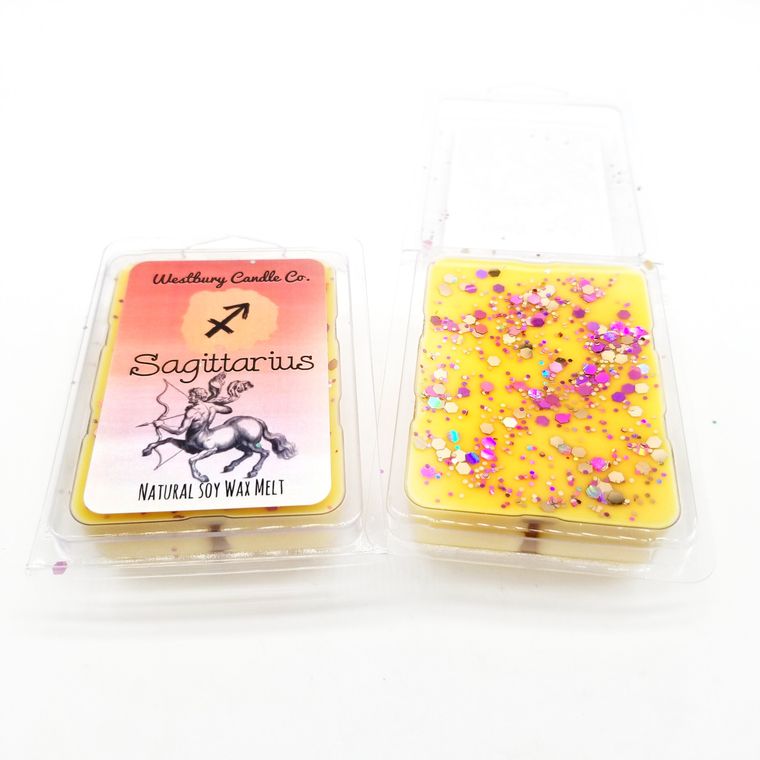 This Sagittarius 2.75 oz. zodiac shimmering soy wax melt is scented with delicious zesty citrus, white sage, and green botanicals - blended with natural soy wax, essential oils, phthalate-free fragrances, shimmering mica, and glitter to take it from basic to bad bitch status!